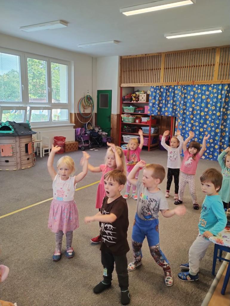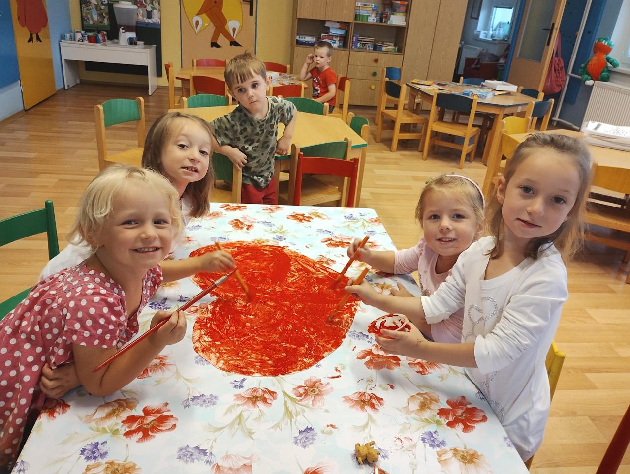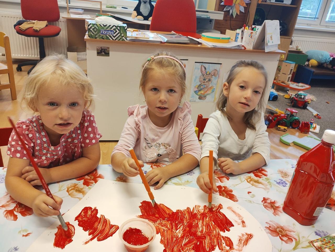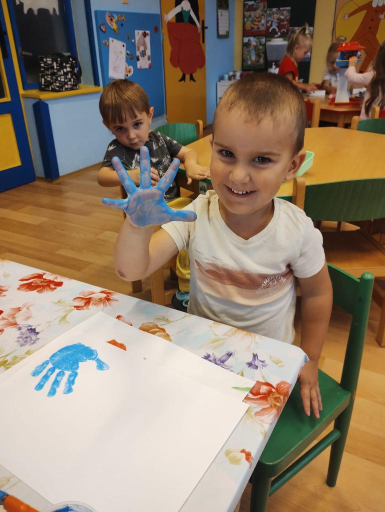 -seznámení s třídními pravidly, společné hry, otisky dlaní a poznávání okolí školky při vycházkách