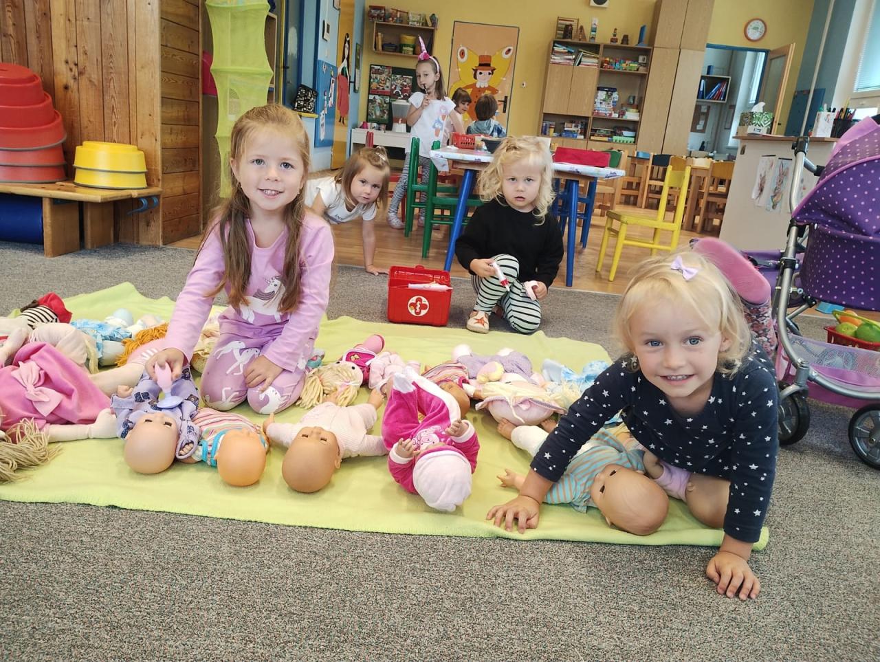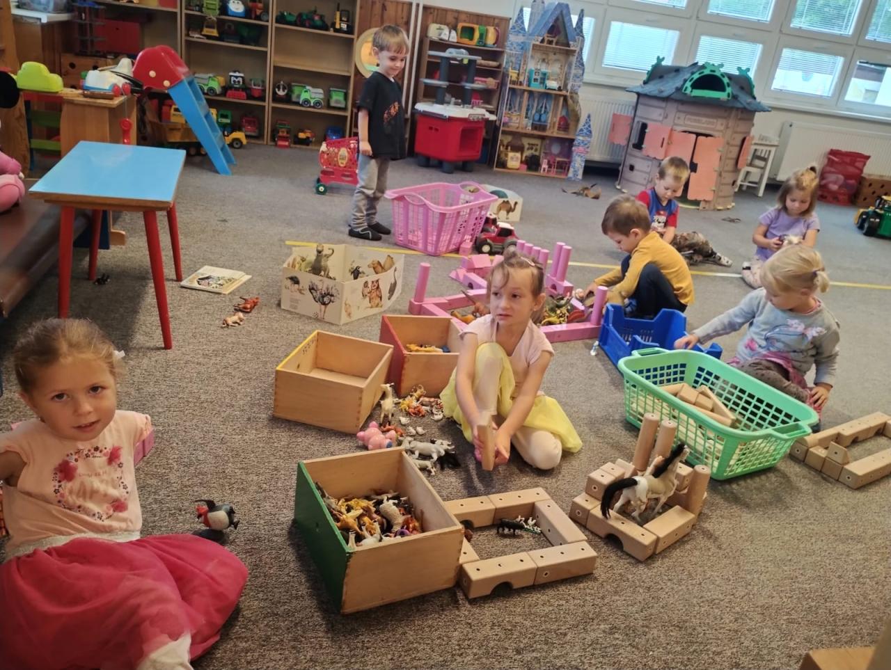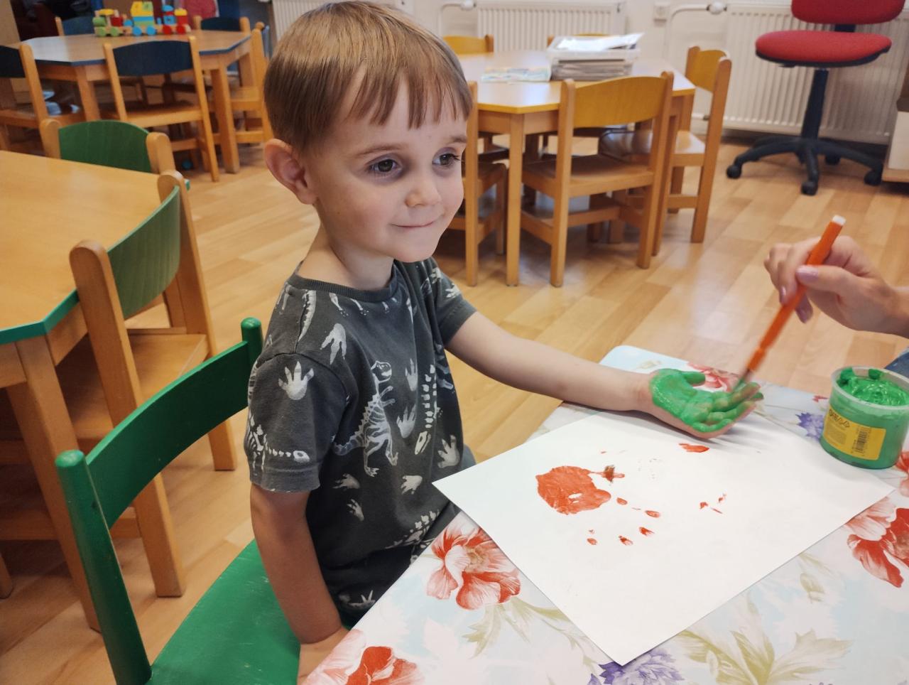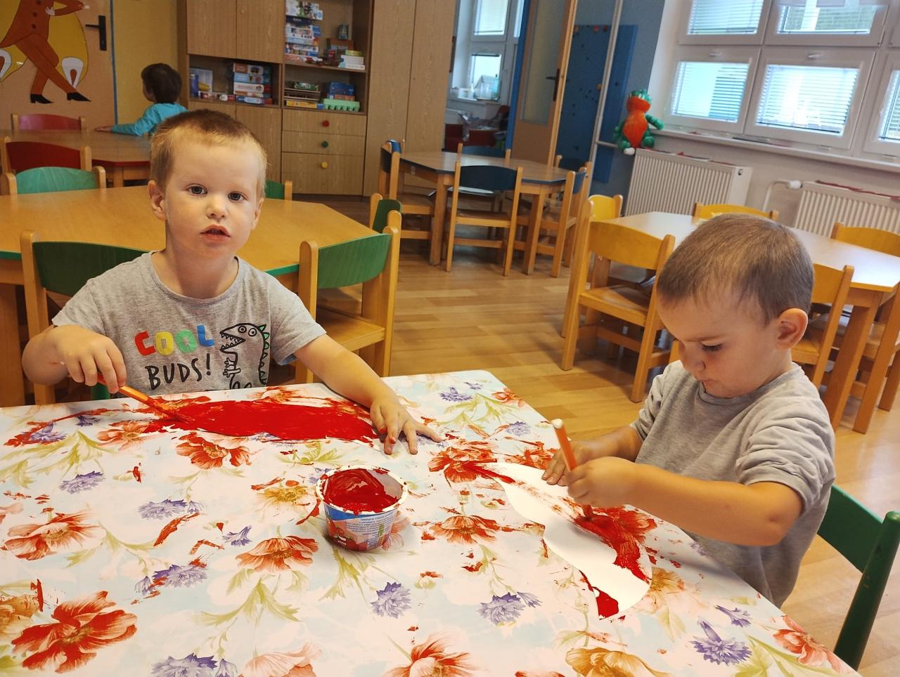 -seznámení s třídními pravidly, společné hry, otisky dlaní a poznávání okolí školky při vycházkách
