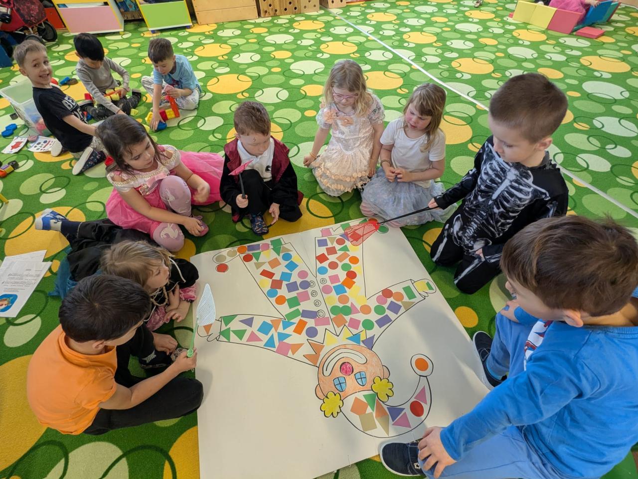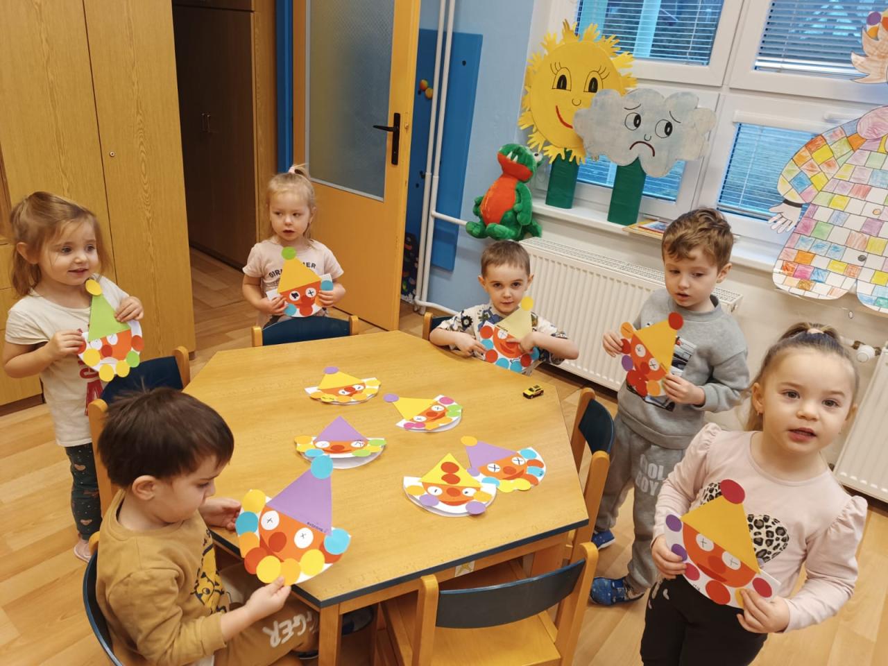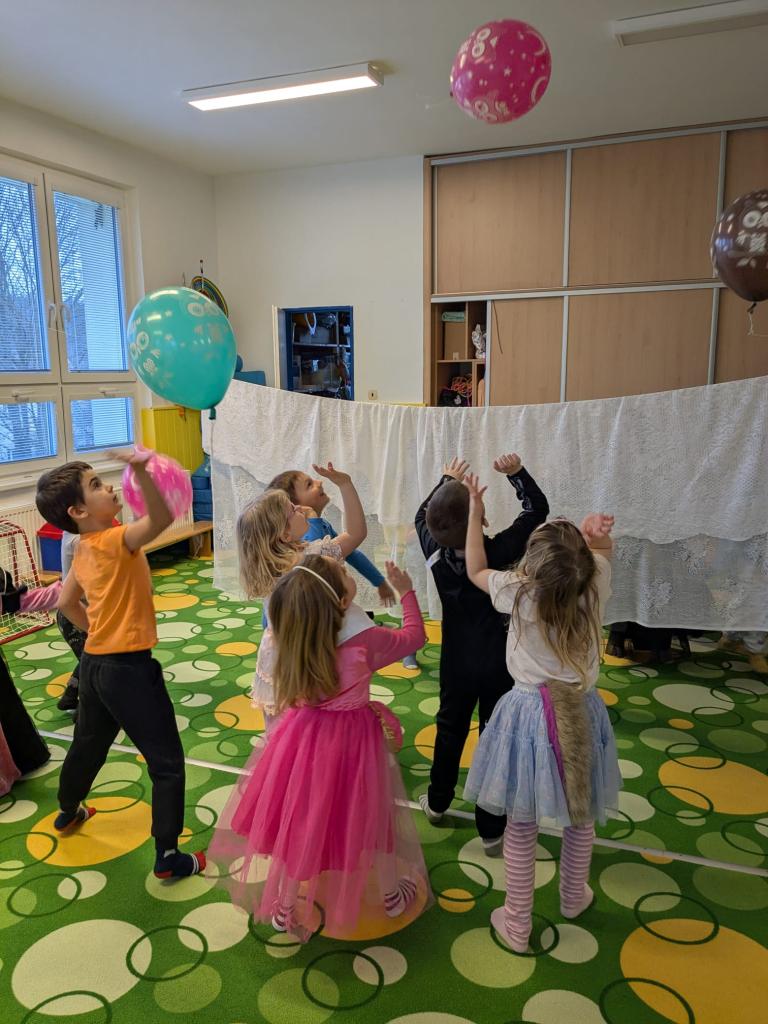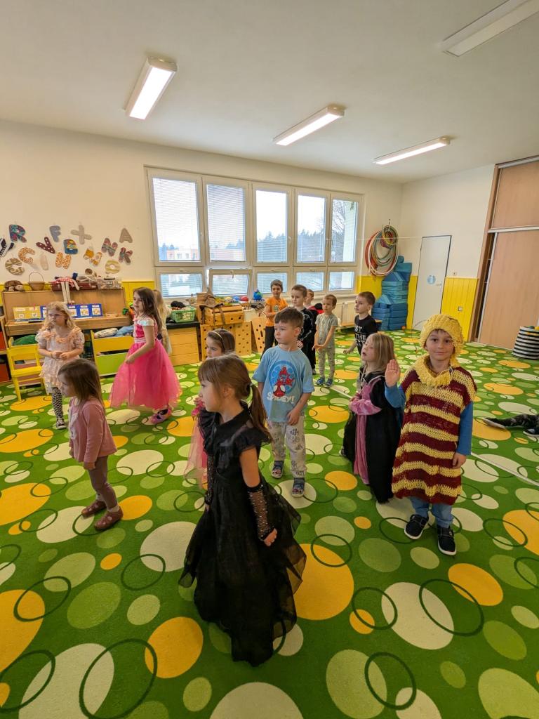 -hry, tanečky, převleky, soutěže, výzdoba plotu, výtvarné tvoření-koláče z papíru a skládaní šašci