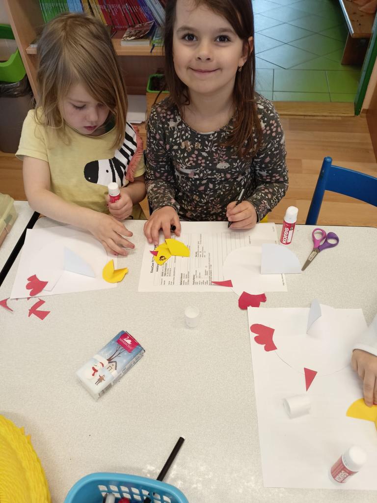 -povídání o jaru, časová posloupnost-jak se líhne kuře, počítání kuřátek, pohybové a didaktické hry motivované domácími zvířaty, vyrábění slepičky a kuřátek z papíru