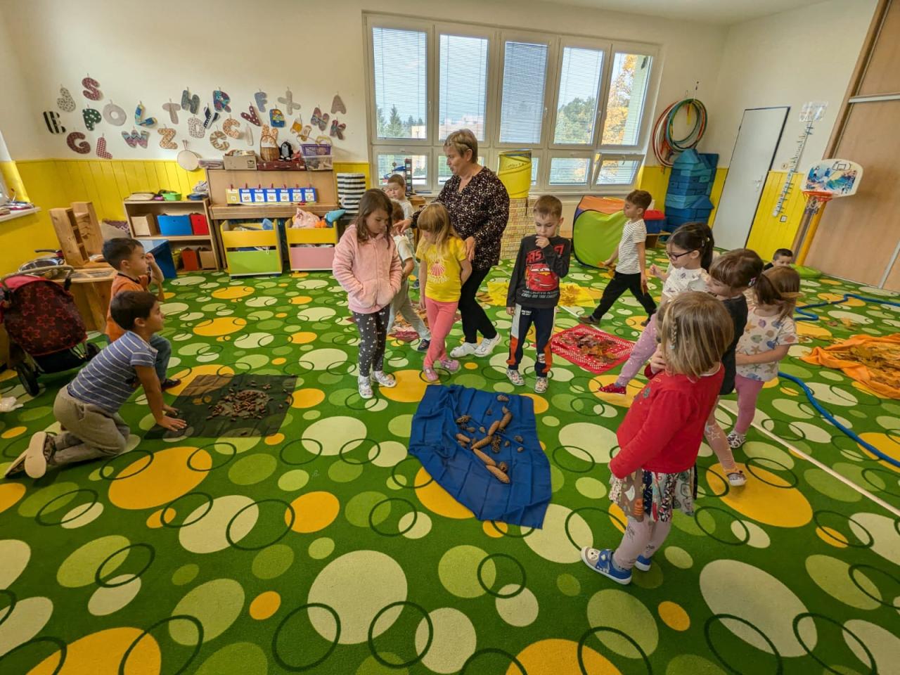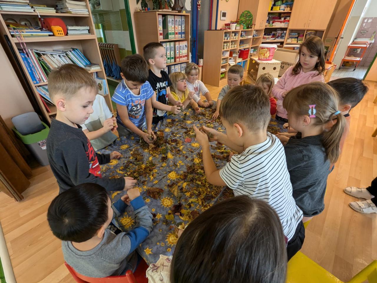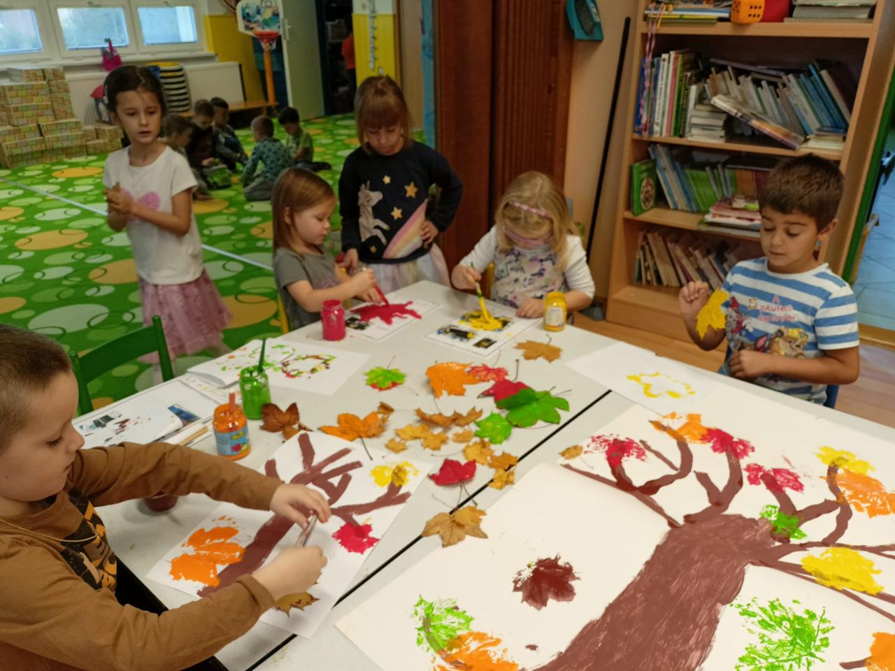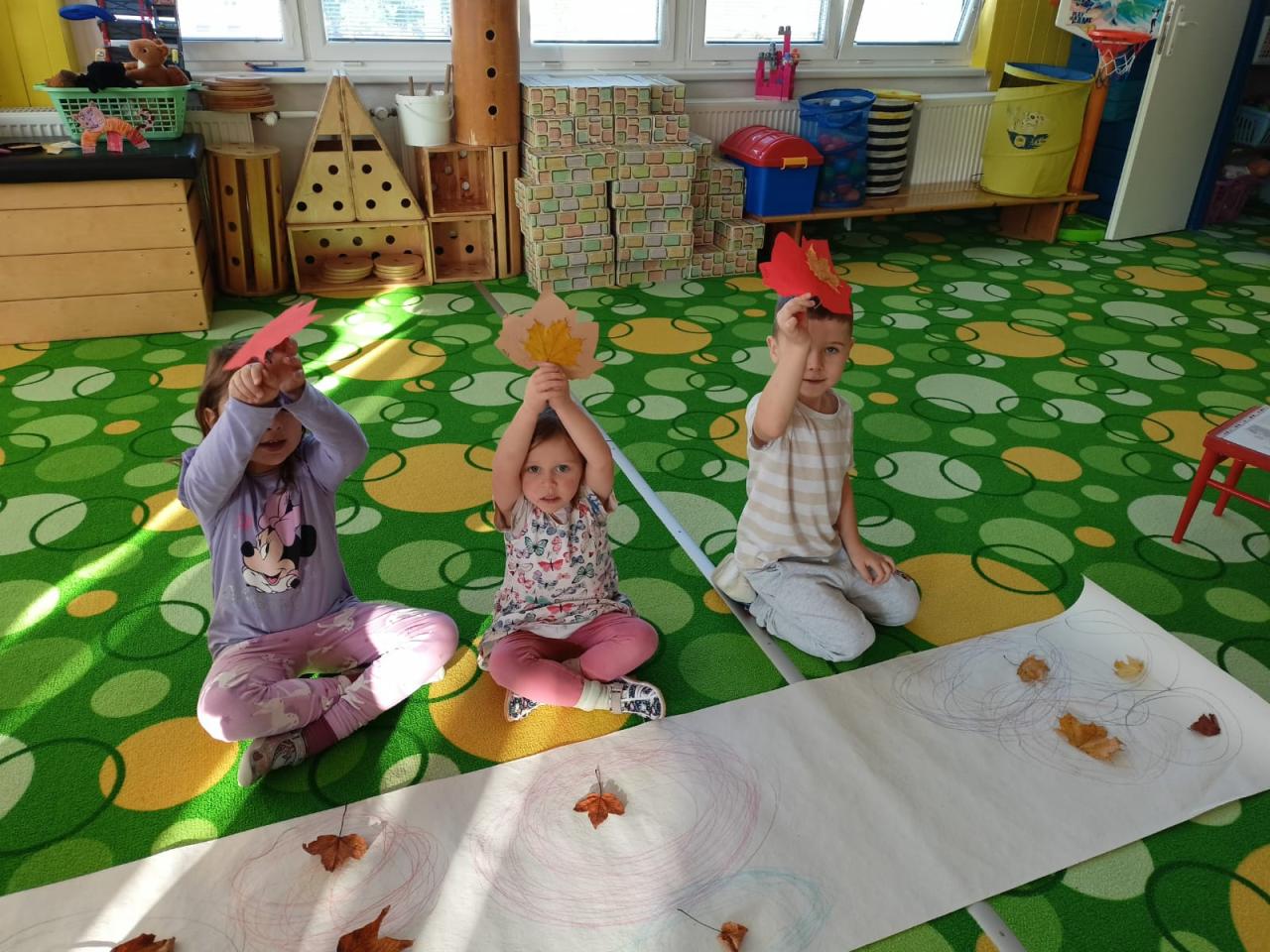 -hry s listy, plody, společné tvoření, třídění podle barev, tvarů a velikostí, výtvarná činnost (strom a housenka), grafomotorika s javorovými listy