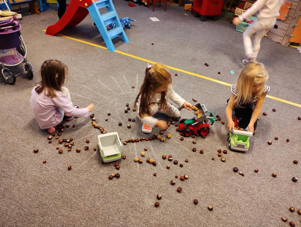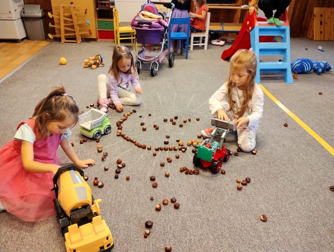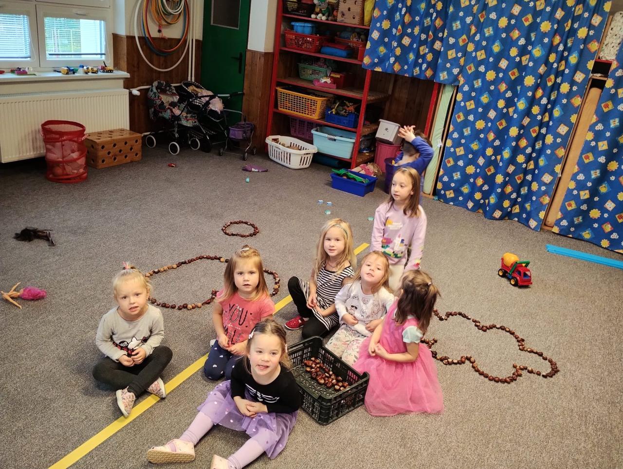 -hry s listy, plody, společné tvoření, třídění podle barev, tvarů a velikostí, výtvarná činnost (strom a housenka), grafomotorika s javorovými listy