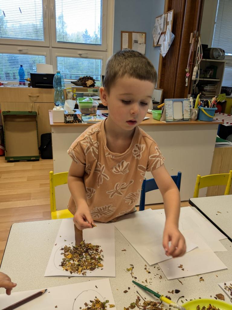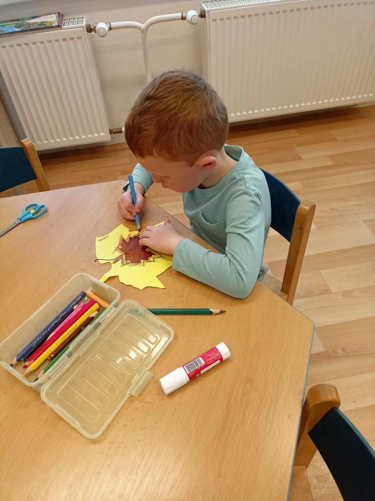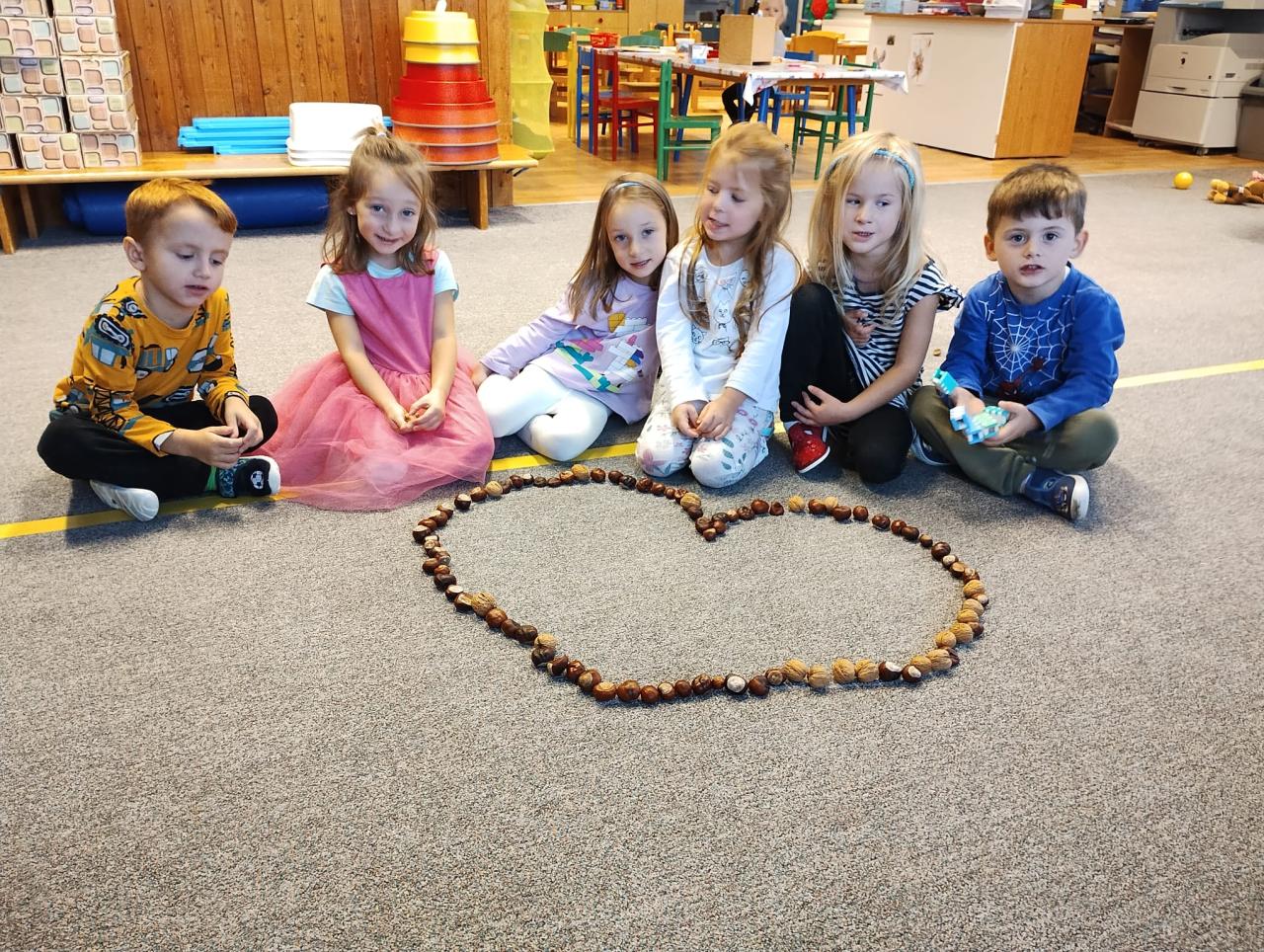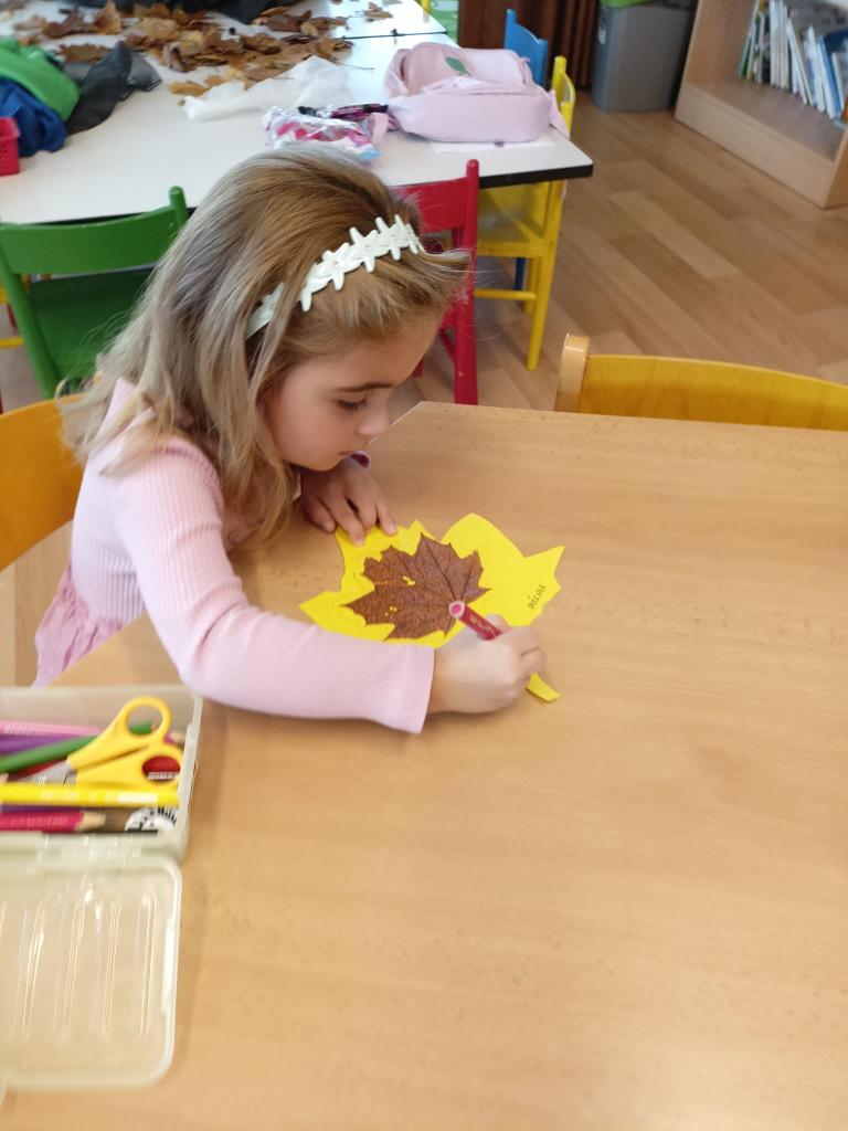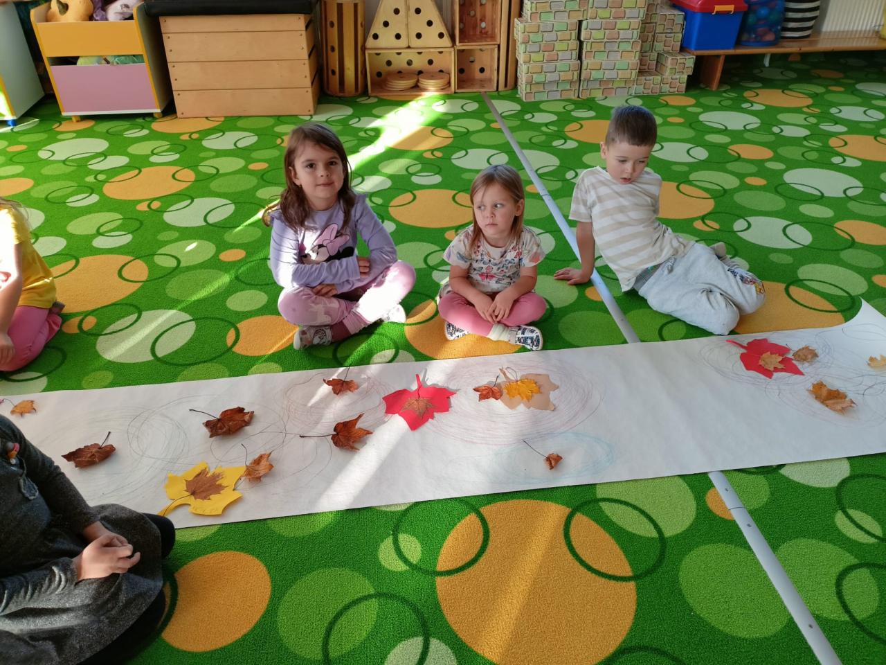 -hry s listy, plody, společné tvoření, třídění podle barev, tvarů a velikostí, výtvarná činnost (strom a housenka), grafomotorika s javorovými listy