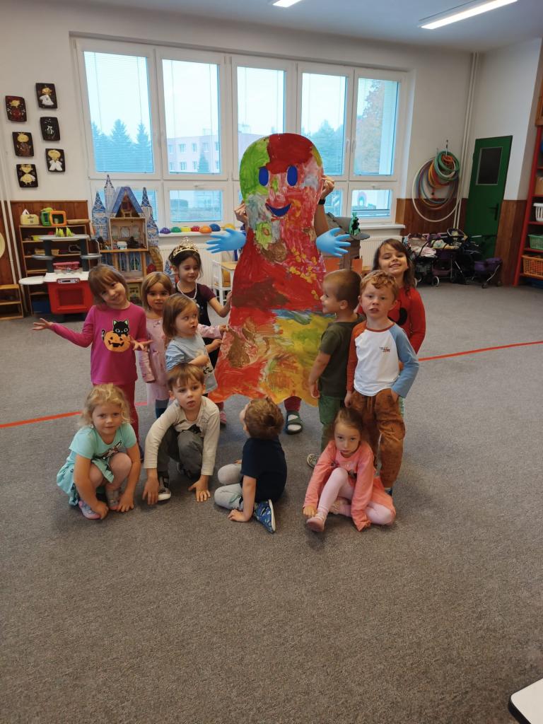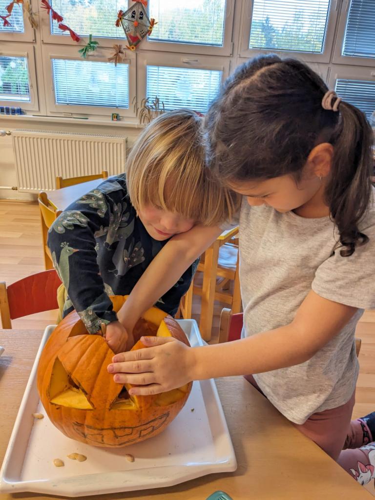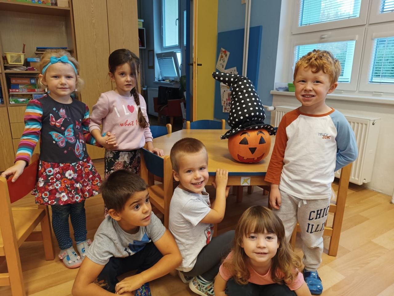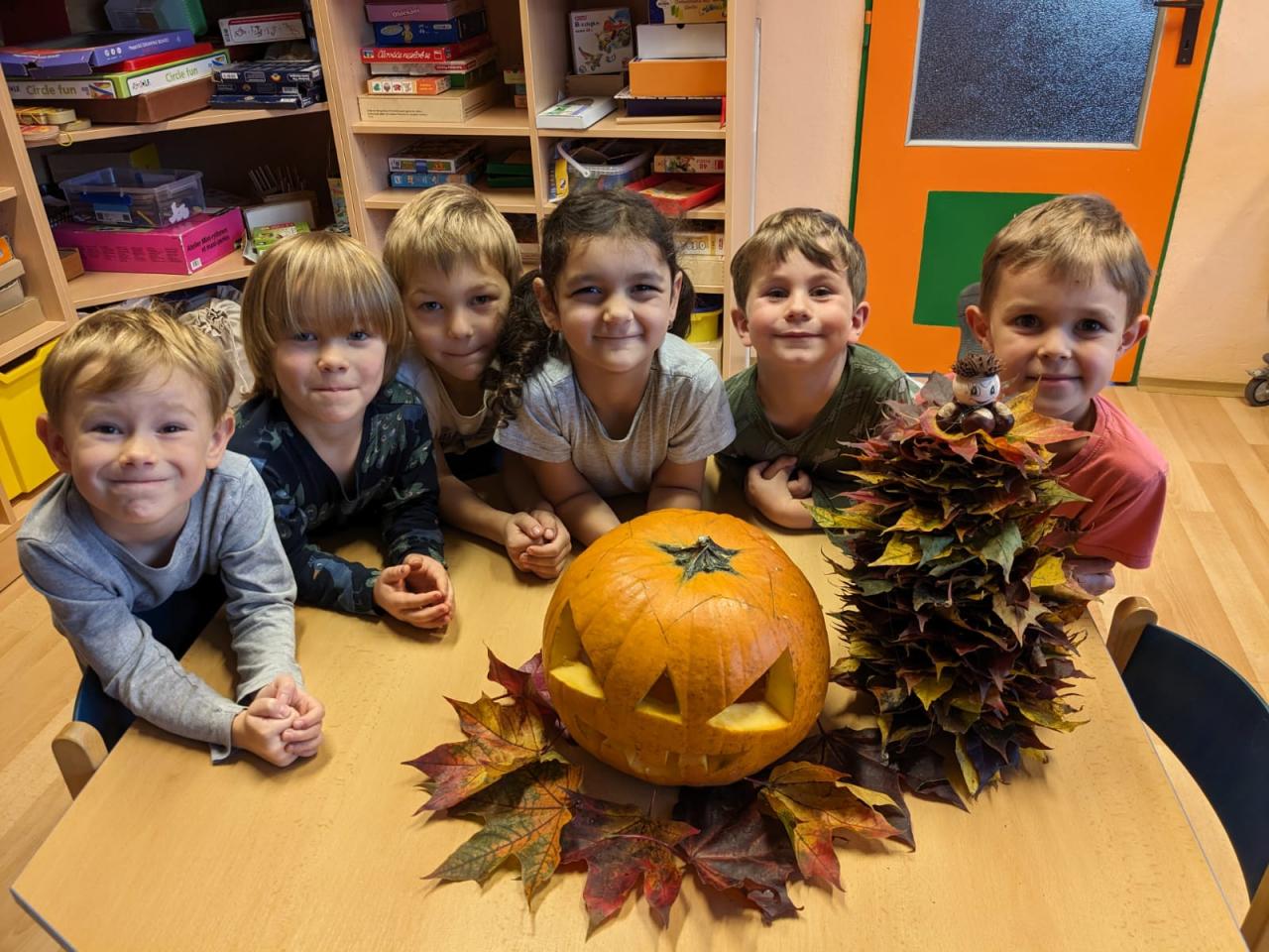-skřítek Podzimníček, školkové strašidlo-společná práce a dlabání dýně