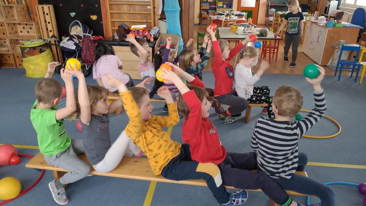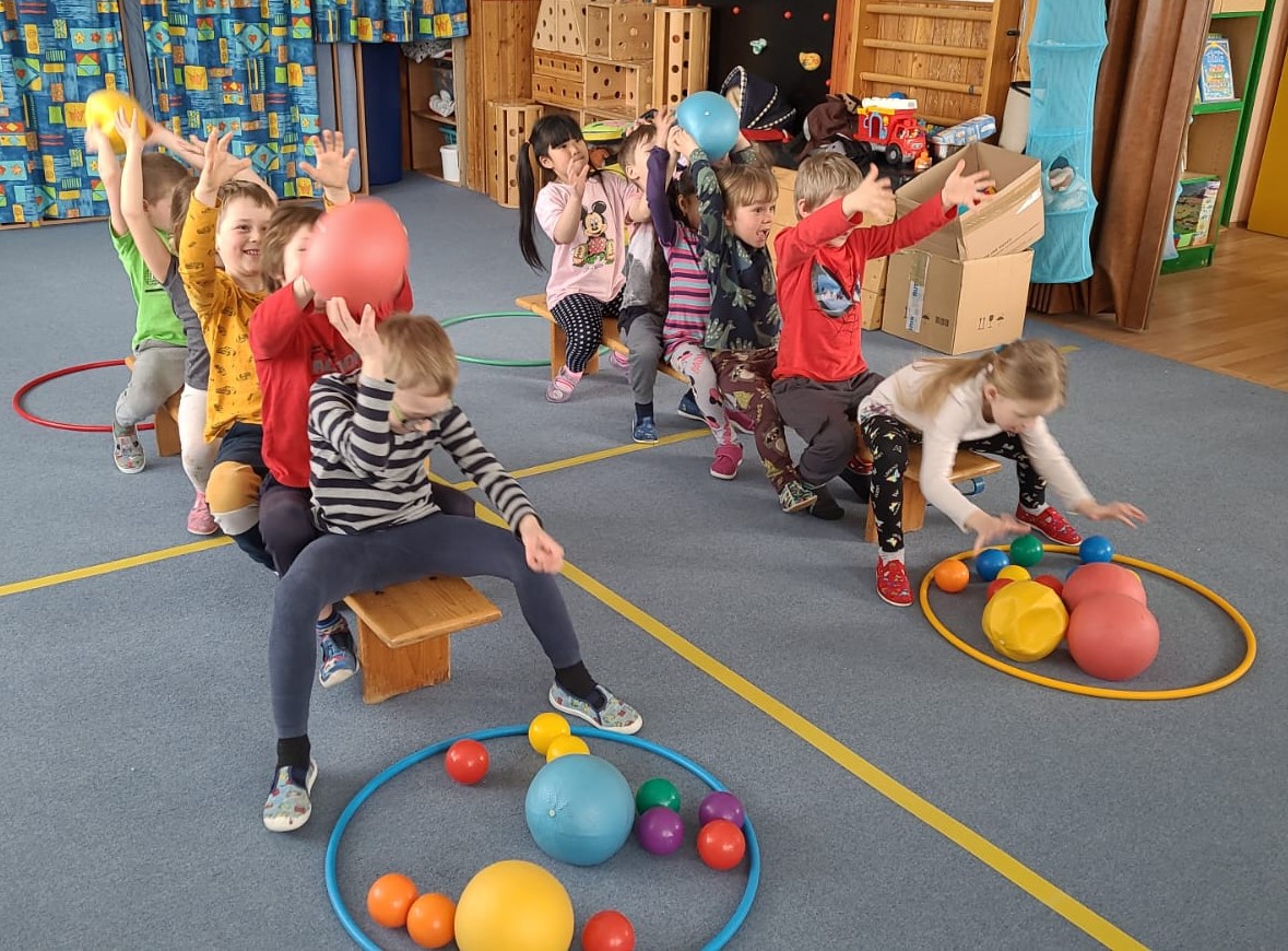 -dramatizace pohádky, výtvarné tvoření, počítání, třídění, porovnávání koblížků a štafetové hry s míči