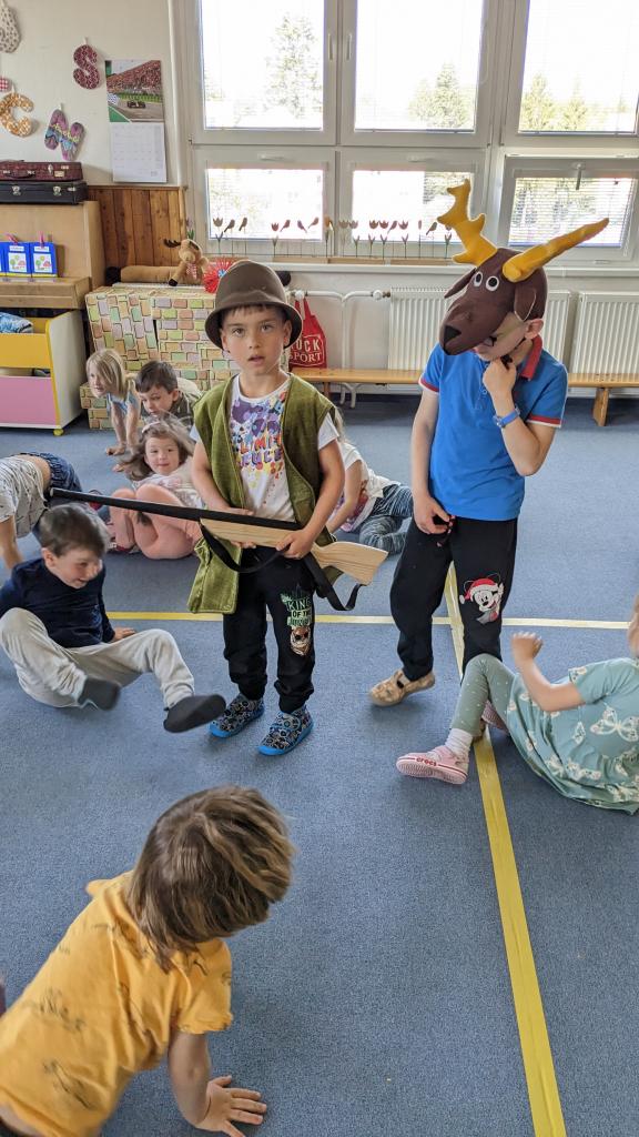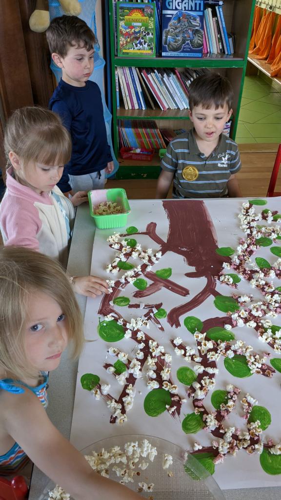 -hra na myslivce a jelena, hádání zvířátek, překážkvá dráha, počítání stromů a vyrábění rozkvetlého stromu z popcornu.