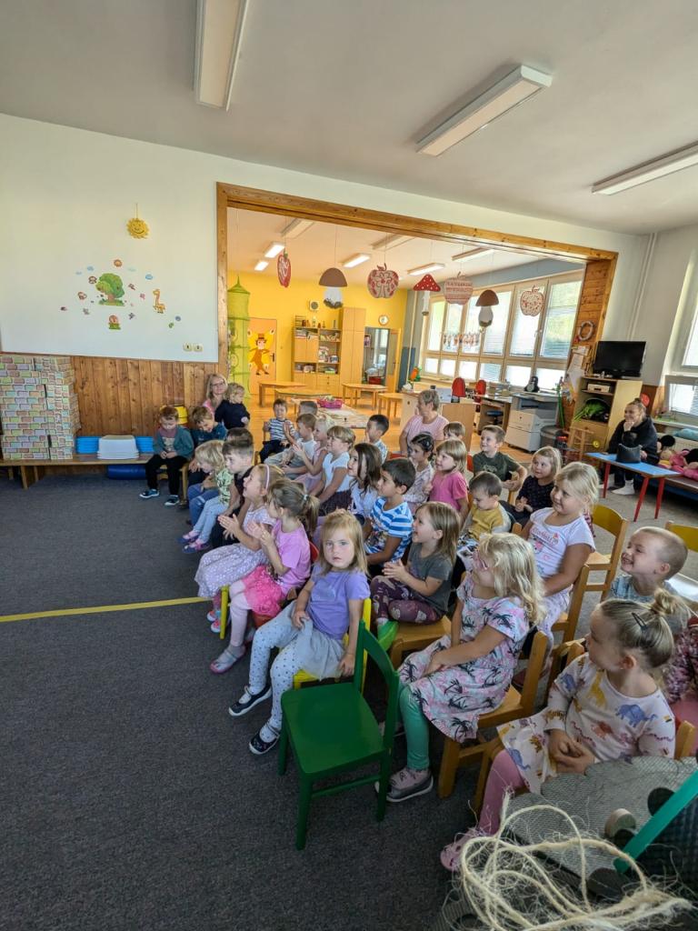 Pan Pohoda z divadla Z bedny zahrál pohádku "O vlkovi a kůzlátkách." Děti si zazpívaly, zahrály a zopakovaly si třídění odpadu.