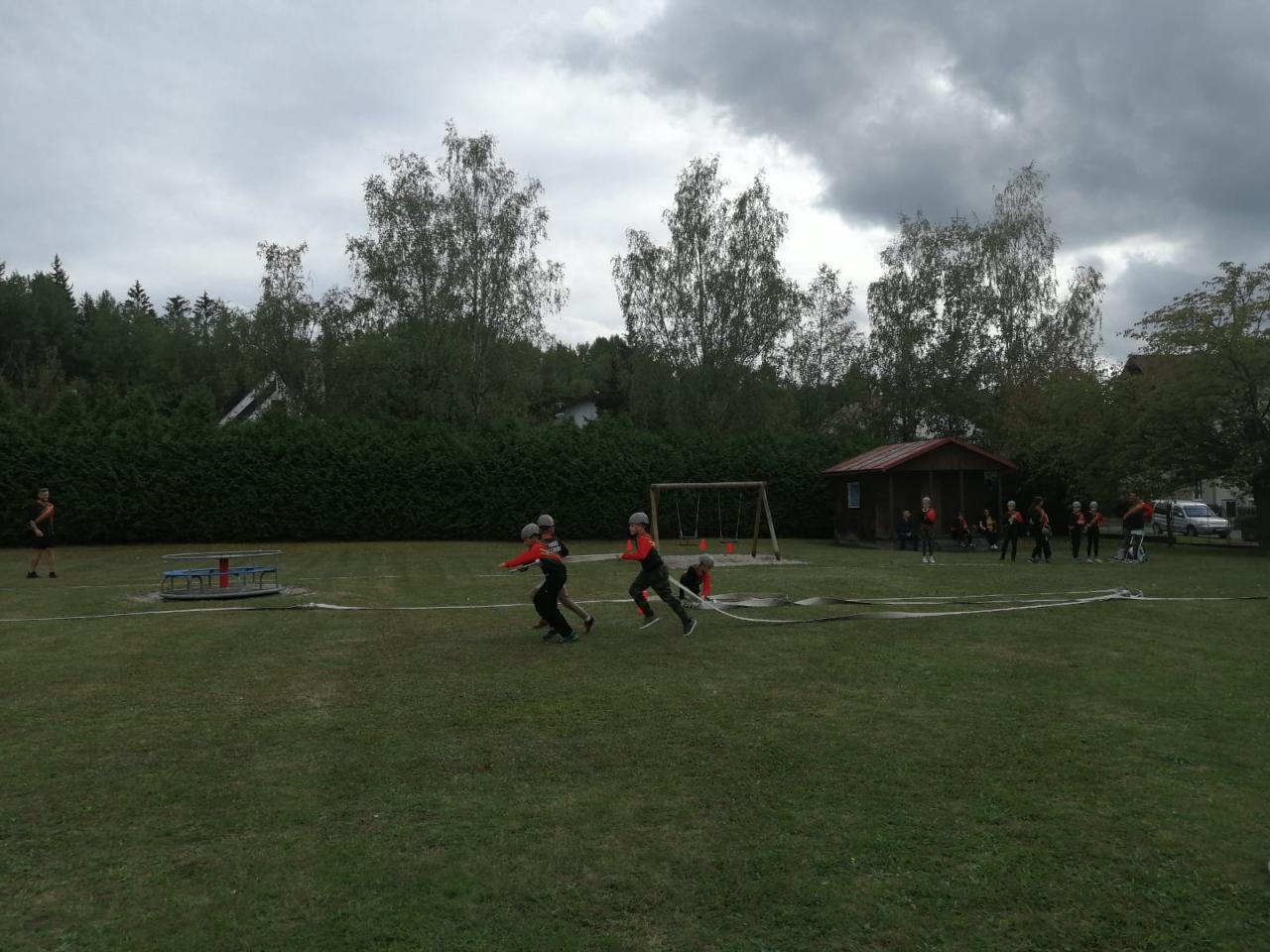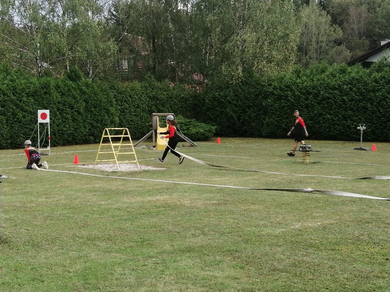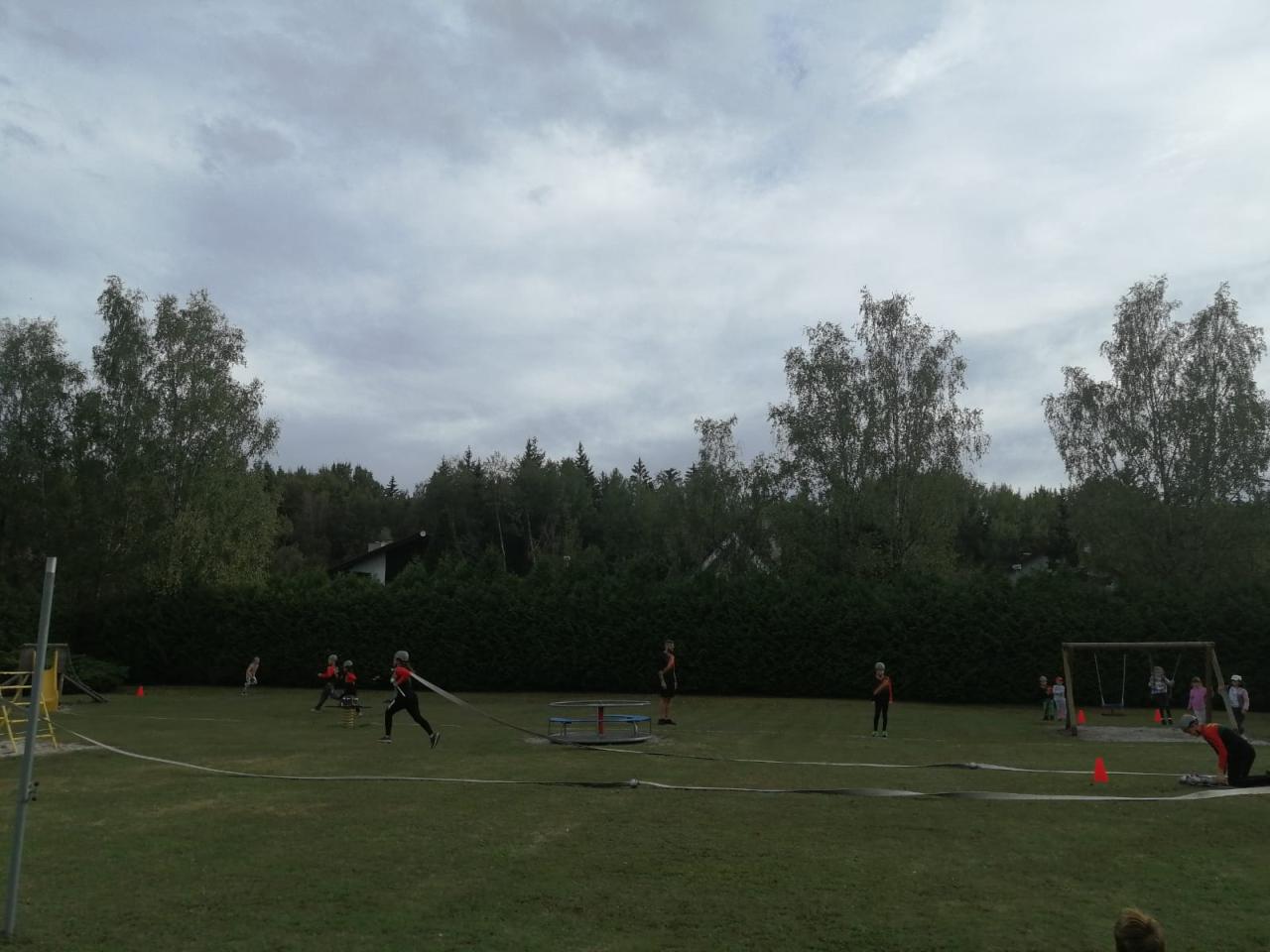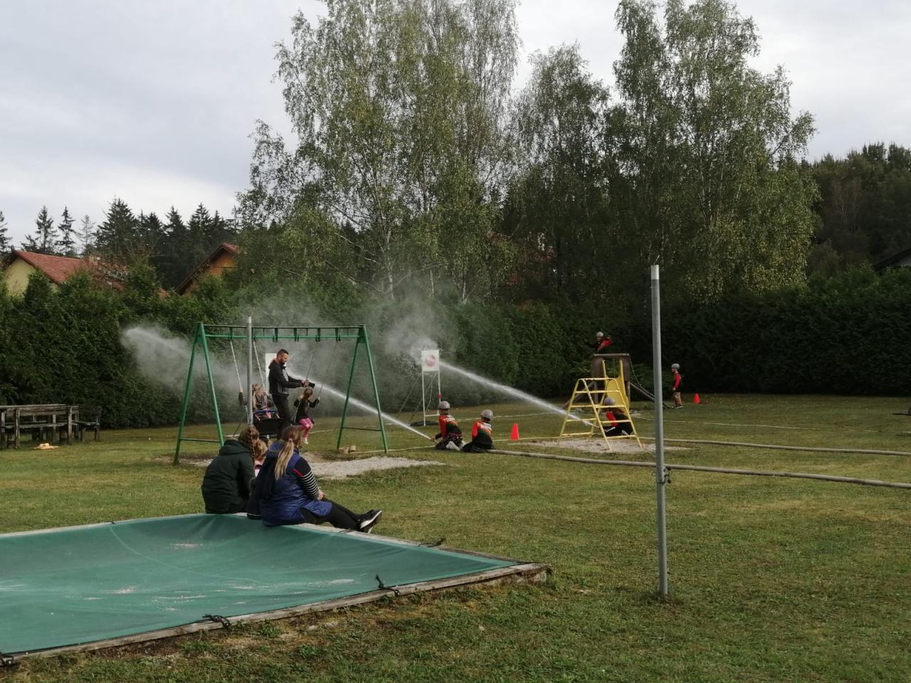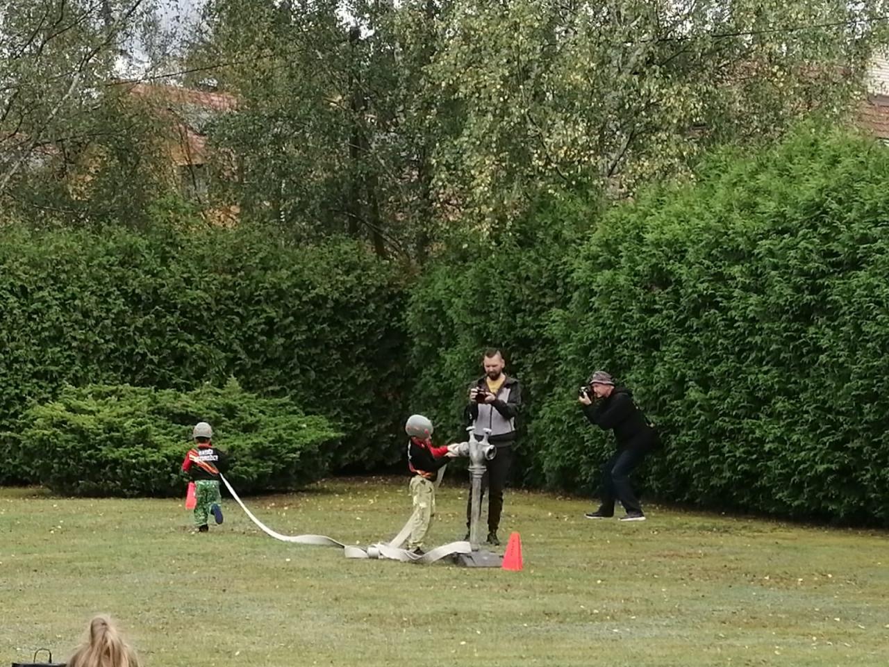 -seznámení s hasičským sportem, předvedení požární rozcvičky, štafety a hasičského útoku na zahradě MŠ