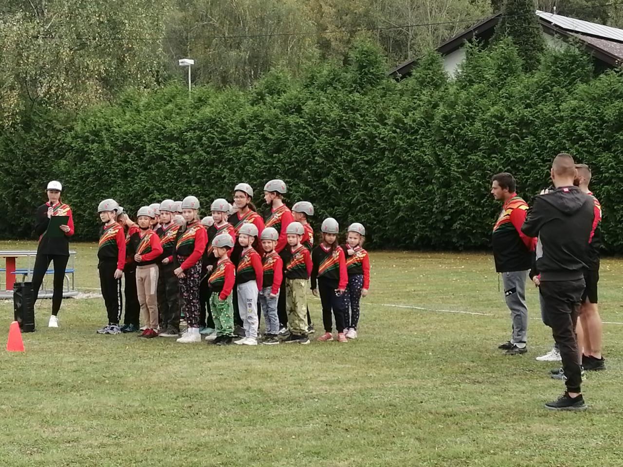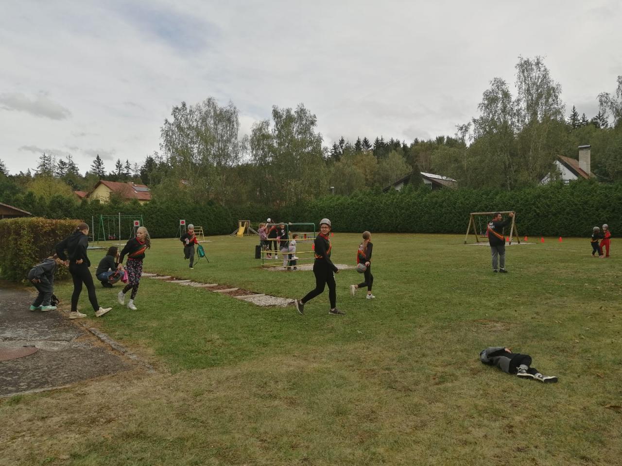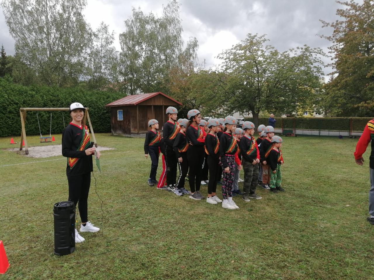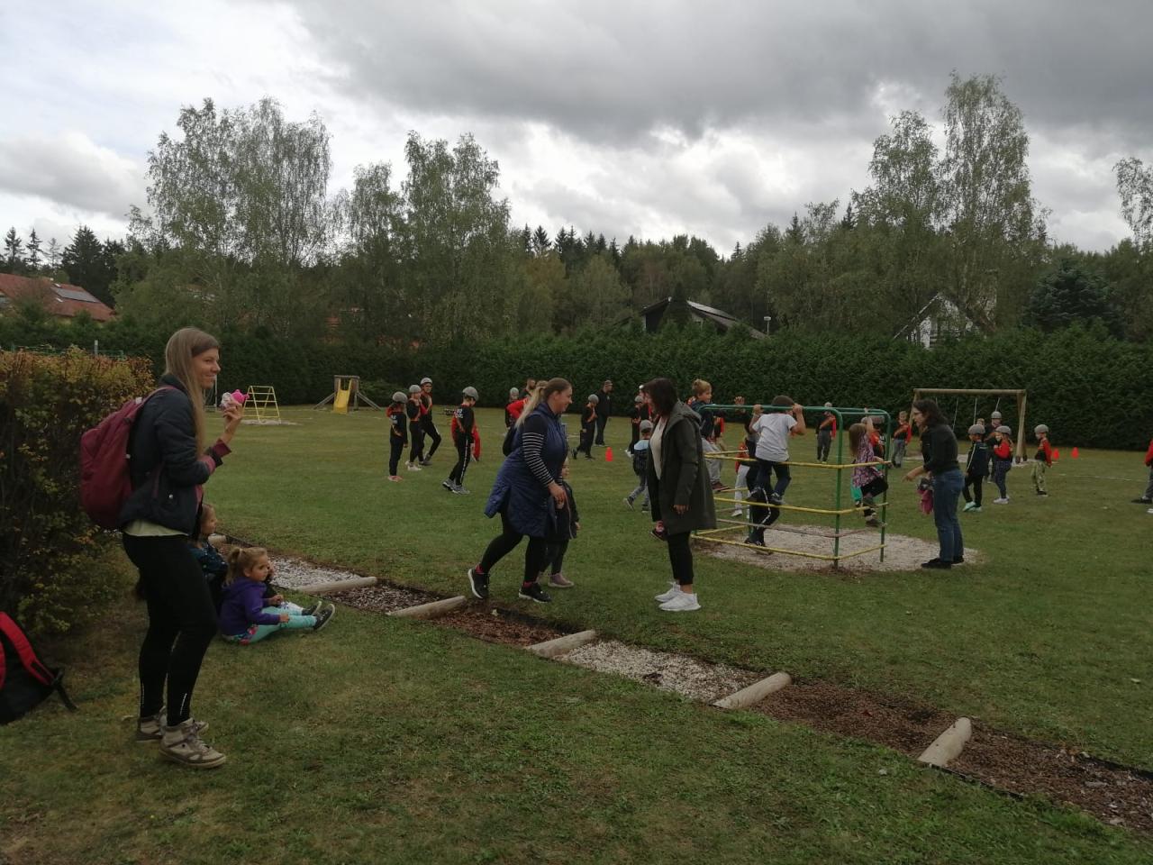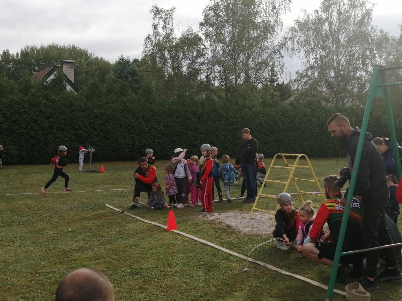 -seznámení s hasičským sportem, předvedení požární rozcvičky, štafety a hasičského útoku na zahradě MŠ