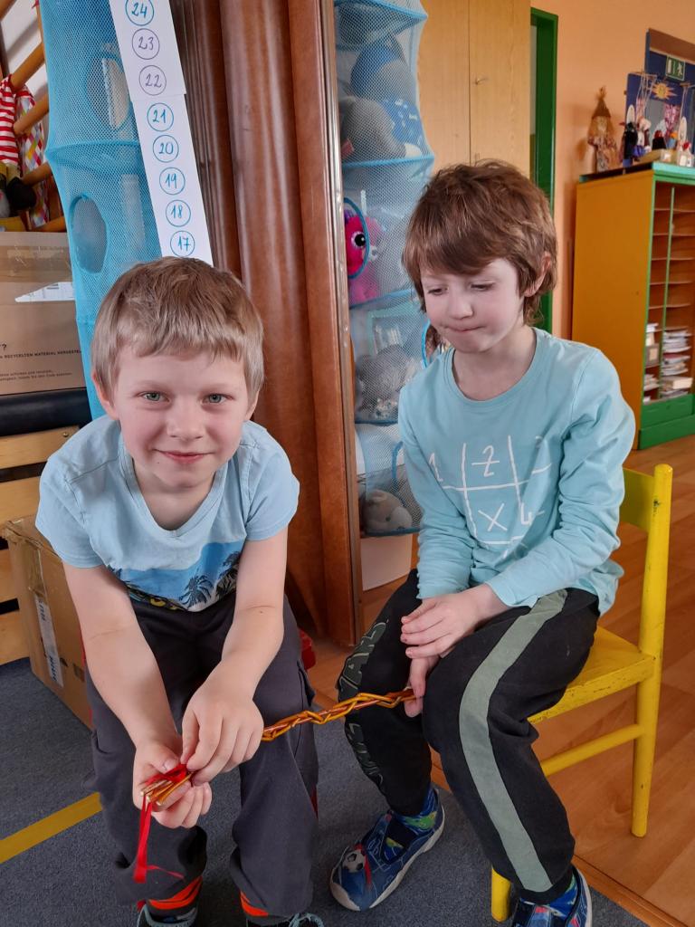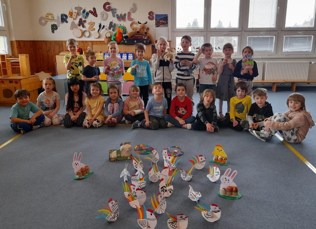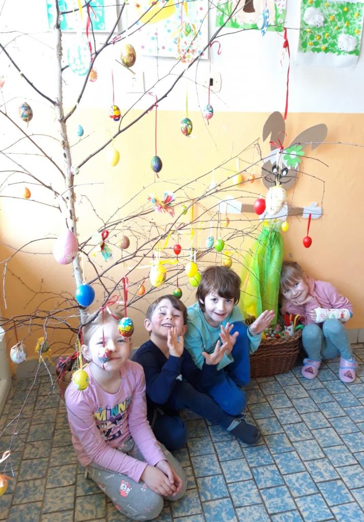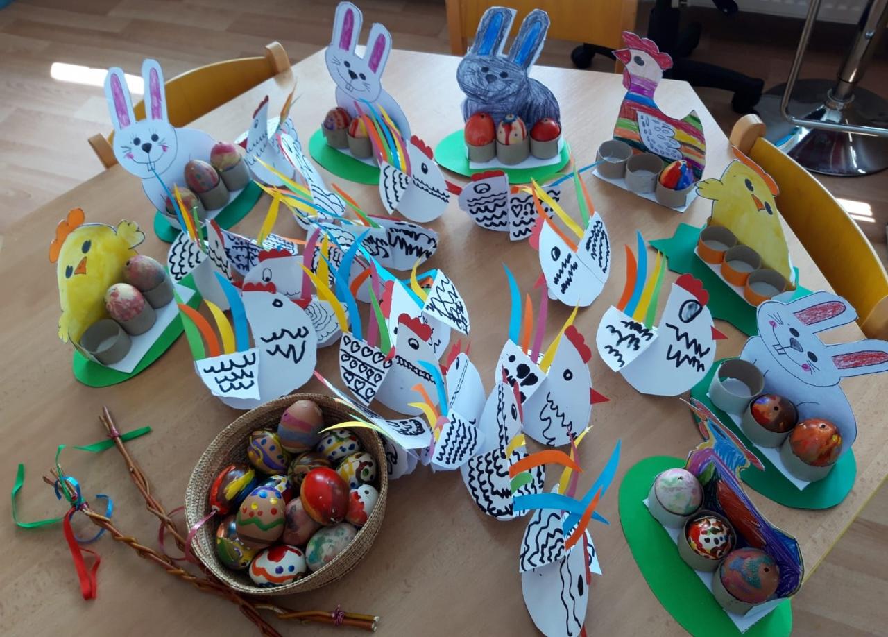 -velikonoční tvoření, pletení pomlázky, symboly a tradice, malování kraslic, výzdoba chodby a počítání vajíček.