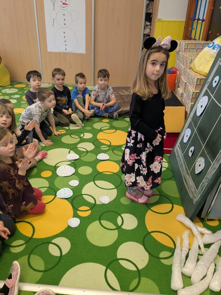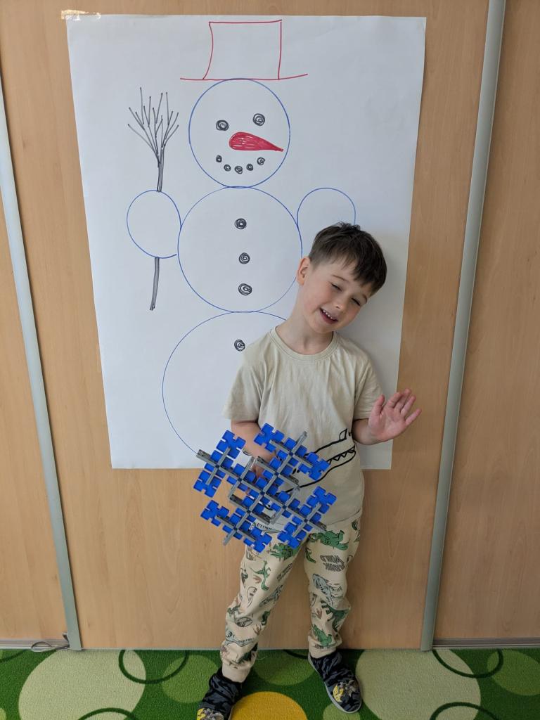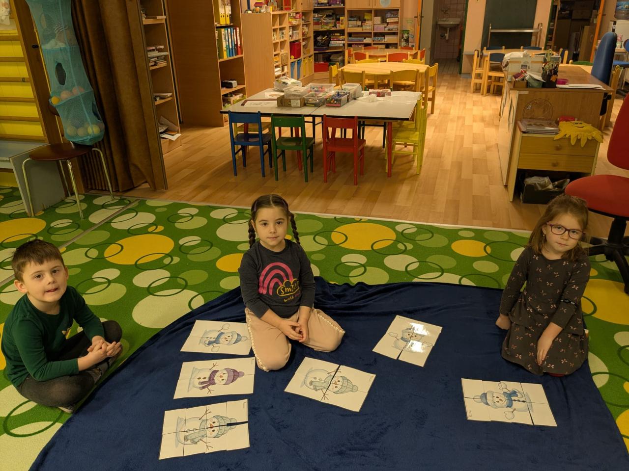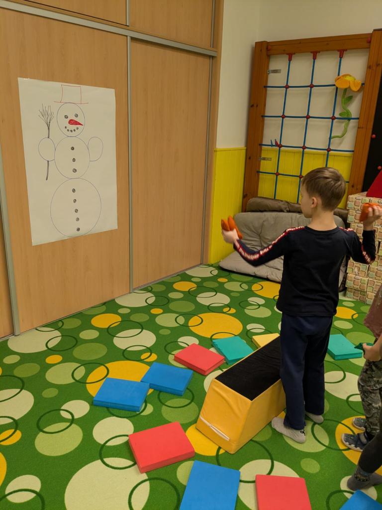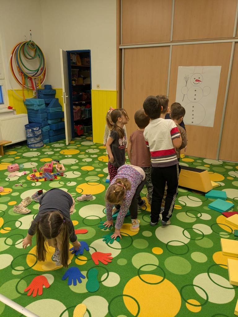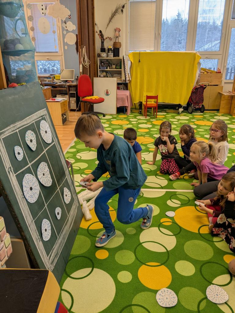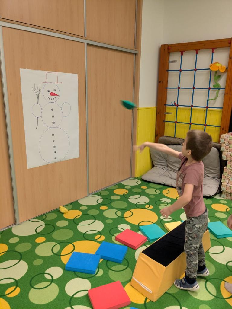 - pohybové a didaktické hry, cvičení s papírovými vločkami, zimní písničky, básničky s pohybem, hod na cíl-sněhuláka, prostorová orientace, výtvarné tvoření