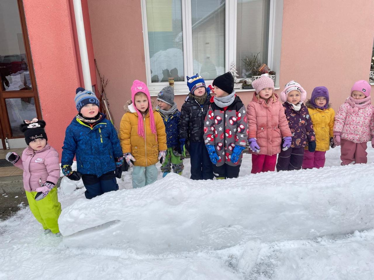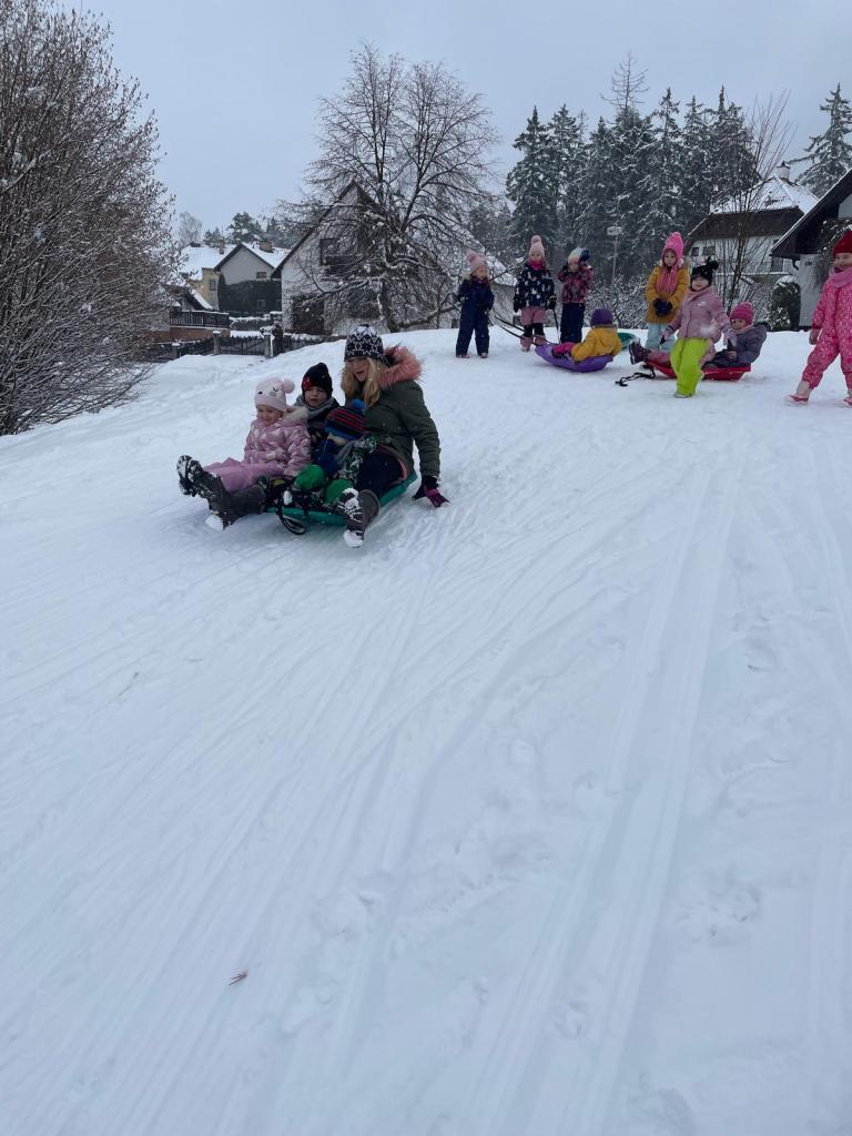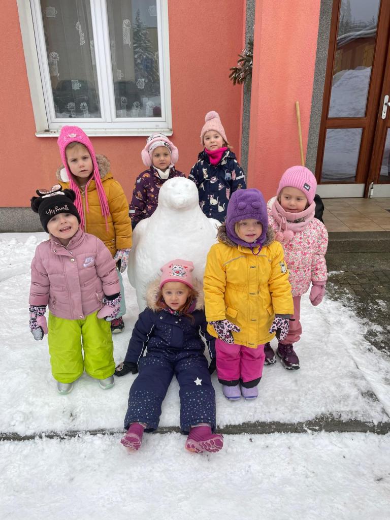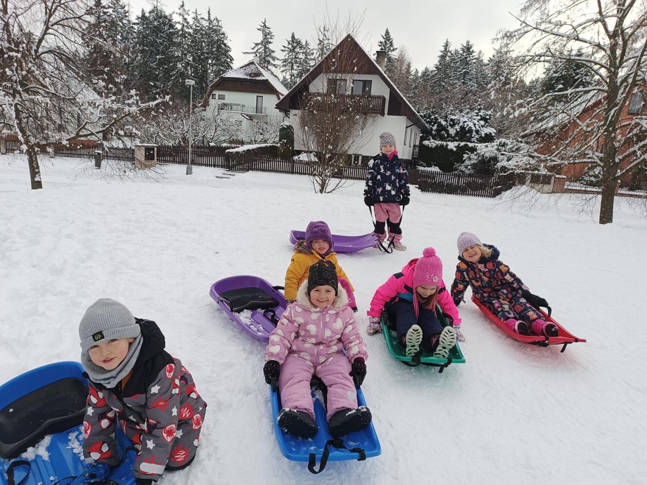 -zimní radovánky, bobování, pozorování stop ve sněhu, návštěva venkovní galerie (sochy ze sněhu), procvičování sebeobsluhy a výtvarné tvoření