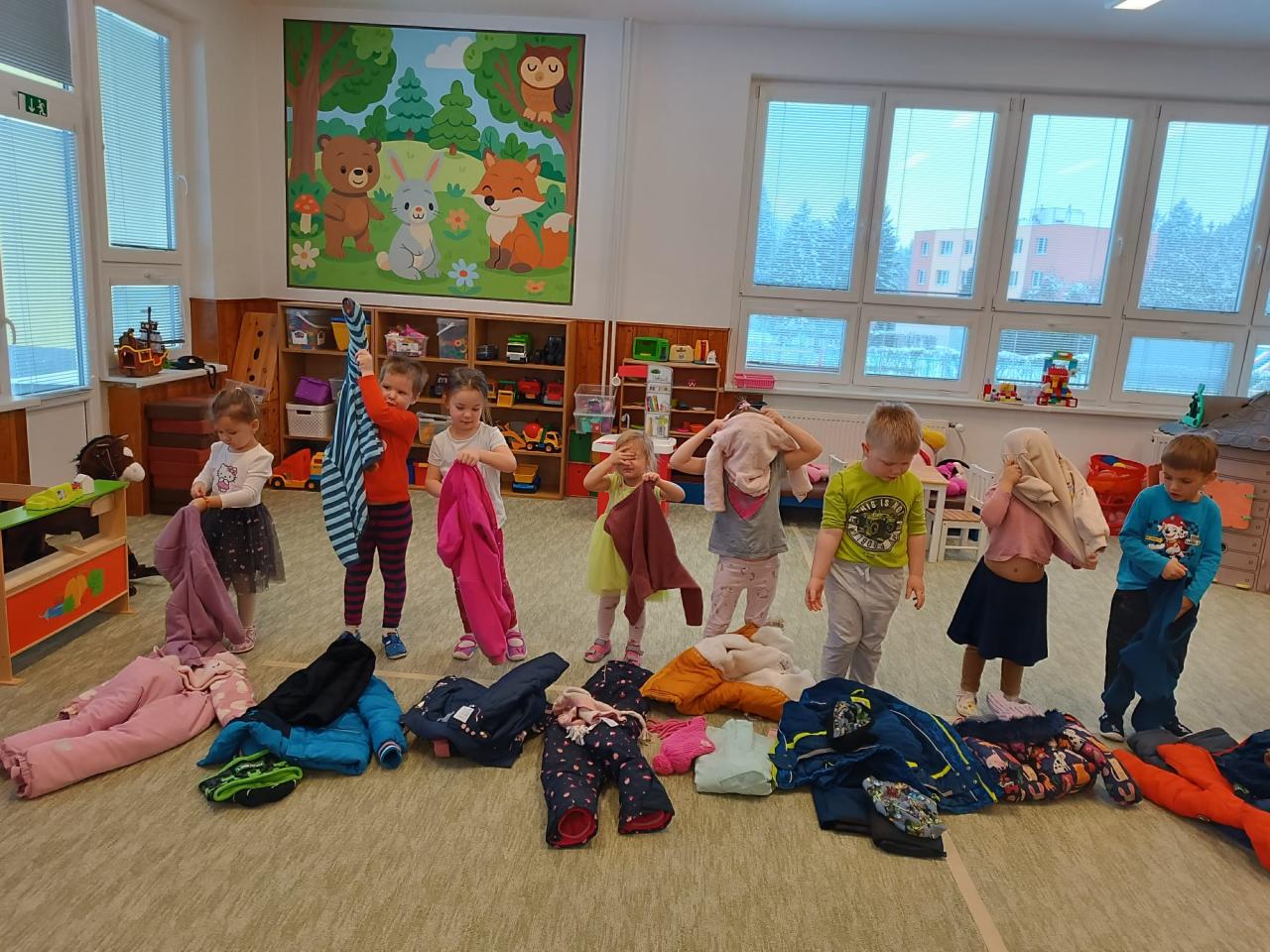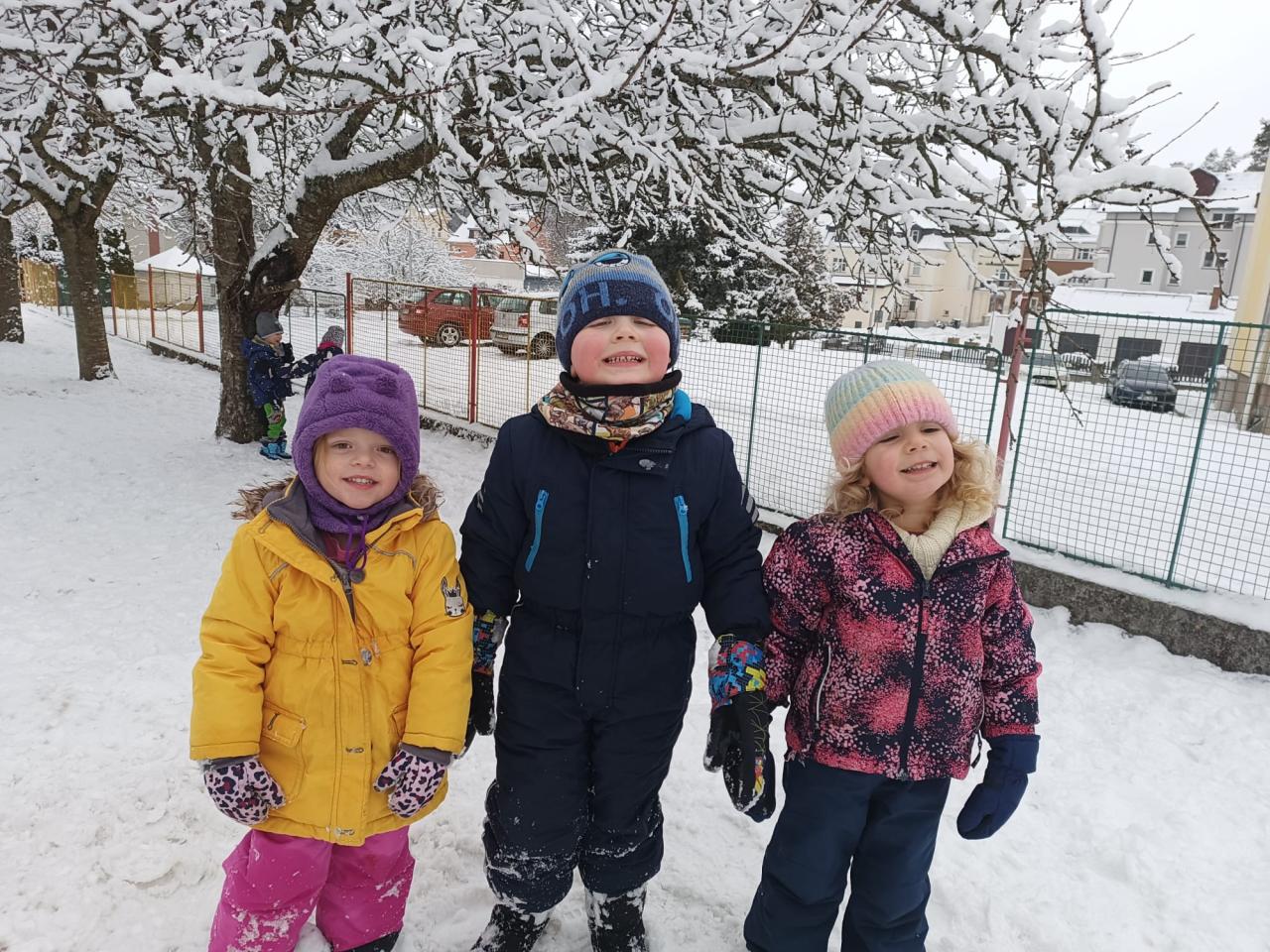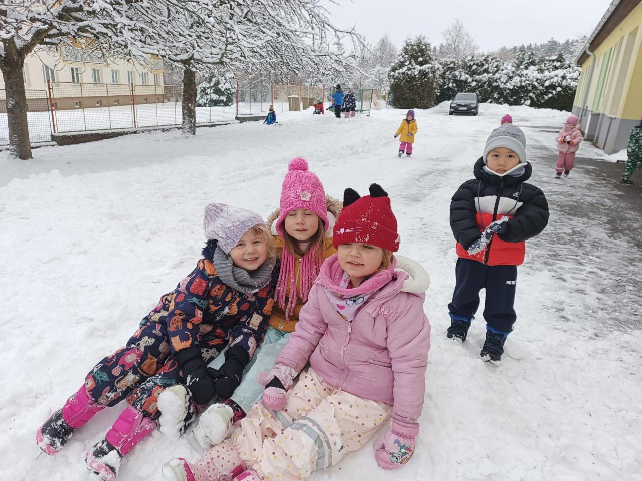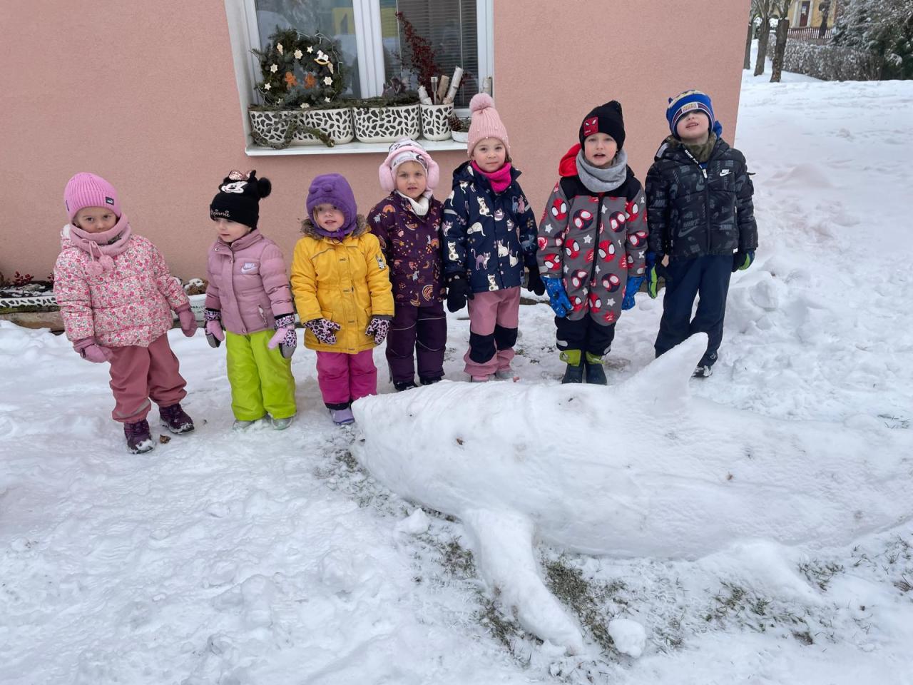 -zimní radovánky, bobování, pozorování stop ve sněhu, návštěva venkovní galerie (sochy ze sněhu), procvičování sebeobsluhy a výtvarné tvoření